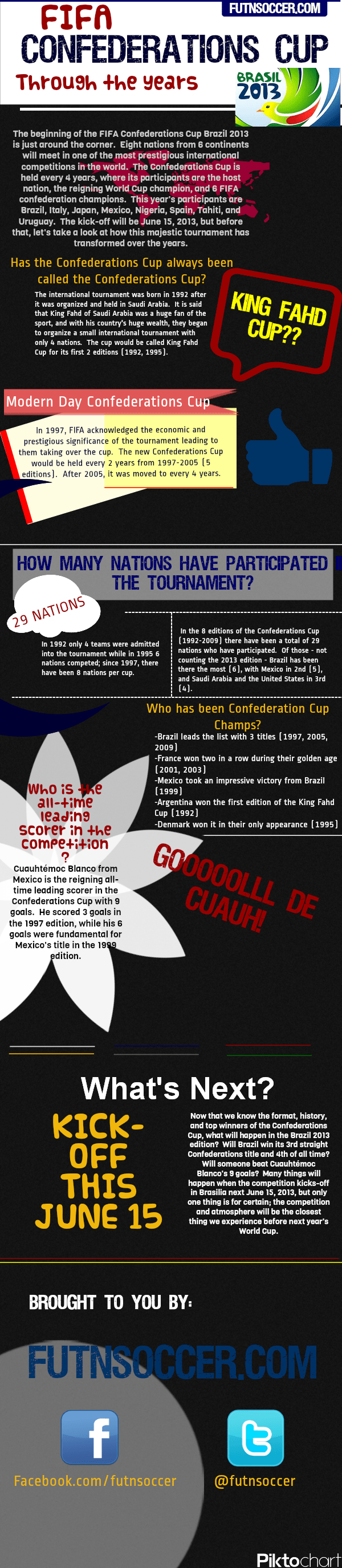 The FIFA Confederations Cup is set to start on June 15, 2013 in Brazil. The Confederations Cup has an interesting history that began in the deserts of Arabia, our infographic covers in detail, how it began what teams have played in it, who has won it, and more.
