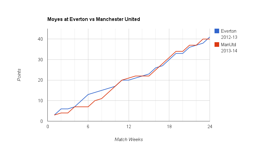 Manchester United fans around the world are fed up with David Moyes’ terrible season as head coach at Old Trafford. However, maybe the fans shouldn’t be mad, considering Moyes is simply doing what he knows how to do best, finishing mid-table. The following chart compares how Moyes’ Everton did in the 2012-13 season (up to Match Week 24), and how Moyes’ Manchester United is doing this season.
